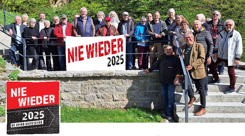 NIE WIEDER – das Bekenntnis der Seliger-Gemeinde zu 80 Jahre Kriegsendes. Am Abgang zum „Tal des Todes“ wo die Gedenktafel der Seliger-Gemeinde für die Sudetendeutschen Sozialdemokraten 2009 angebracht wurde, gedachten die Teilnehmer des Frühjahrsseminar den Opfern. Vor fast genau 80 Jahren, am 23.04.1945 wurde das Konzentrationslager Flossenbürg und die Überlebenden von US-amerikanischen Truppen befreit.