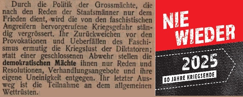 Durch die Politik der Großmächte, die nach den Reden der Staatsmänner nur dem Frieden dient, wird die von den faschistischen Angreifern hervorgerufene Kriegsgefahr ständig vergrößert. Ihr Zurückweichen vor den Provokationen und Überfällen des Faschismus ermutigt die Kriegslust der Diktatoren; statt einer geschlossenen Abwehr stellen die demokratischen Mächte ihnen nur Reden und Resolutionen, Verhandlungsangebote und ihre eigene Uneinigkeit entgegen. Ihr letzter Ausweg ist die Teilnahme an dem allgemeinen Wettrüsten.